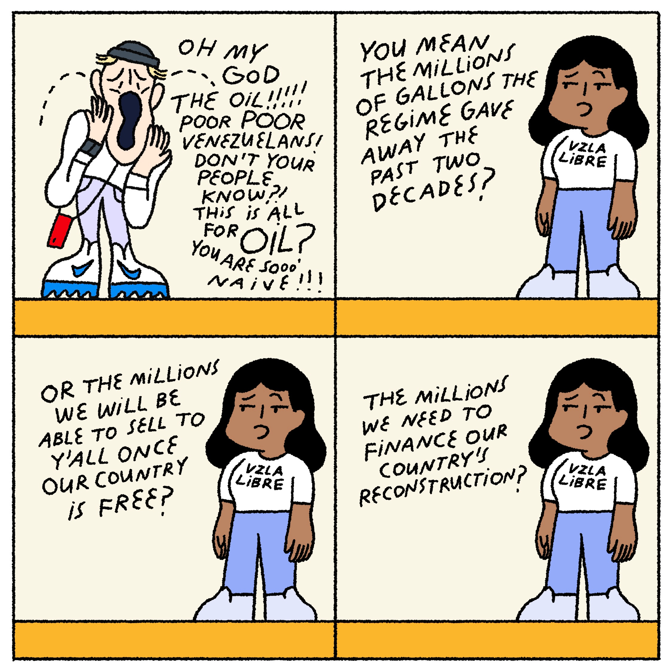 La verborrea de mi tía pronto se me contagia y se traduce en verborrea digital. Comienzo a compartir stories como si la libertad de mi país dependiera de ello. Comienzo a explicar, una y otra vez, lo que para nosotros parece obvio y el mundo parece incapaz de comprender: que, a pesar de la incertidumbre, a pesar del peligro que todo esto implica, a pesar de las infinitas contradicciones, a pesar de aborrecer al supuesto liberador, a pesar del terror, a pesar de no estar de acuerdo con una intervención… el que haya ocurrido nos llena de una nebulosa esperanza; pero esperanza, al fin y al cabo. Una esperanza inconcebible apenas un día antes.